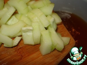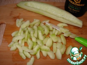 Огурец почистить, чайной ложкой удалить семена и нарезать небольшими ломтиками.