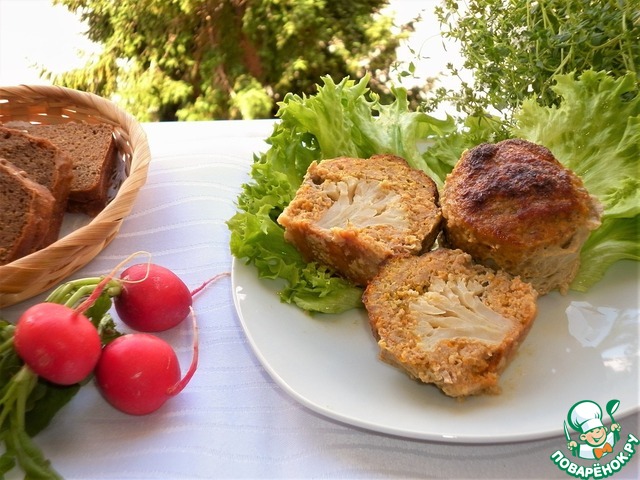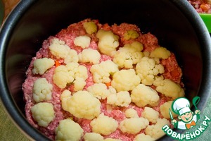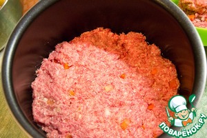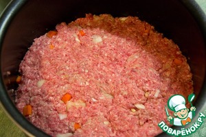Смешать его с фаршем, яйцами. Посолить и поперчить по вкусу. Добавить нарезанный мелко лук и кубиками морковь. Если фарш густоват — добавьте еще молока.