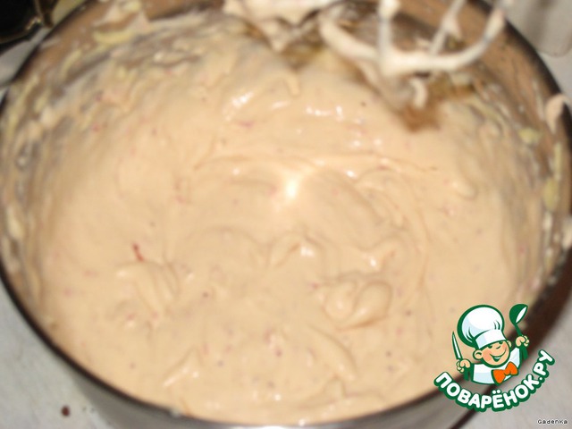 Ввести желатин в сырный крем, немного взбить, добавить клубничное пюре, опять слегка взбить и отставить в посуду с холодной водой.