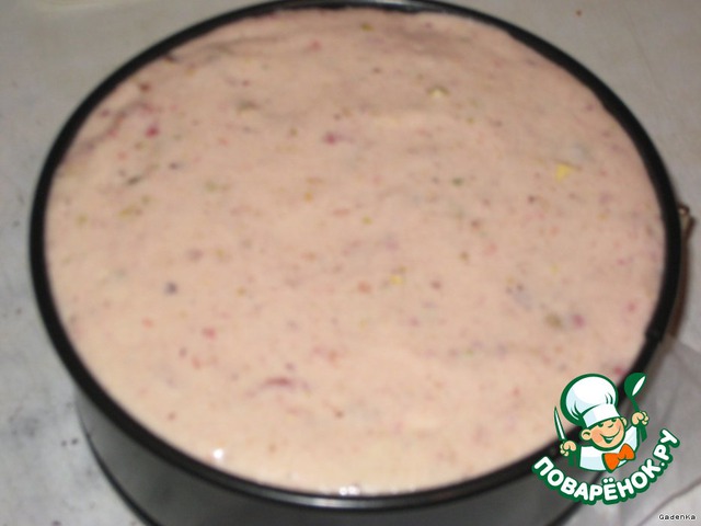 Сверху на корж выложить клубнично-сырную массу и убрать в холодильник на 4 часа.
