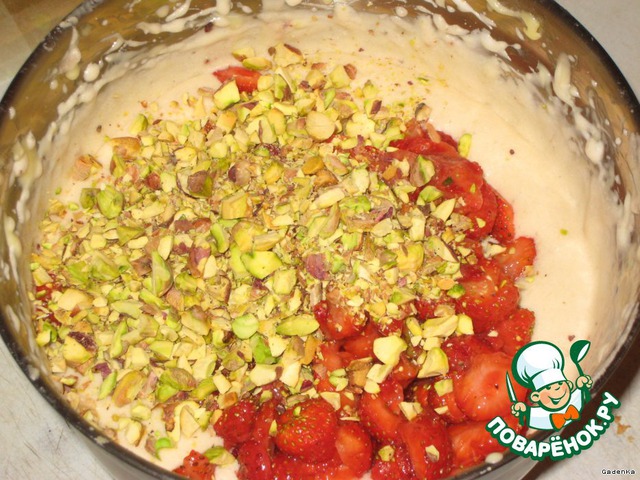 Оставшуюся клубнику порезать. Добавить порубленные фисташки и порезанную клубнику. Все перемешать вручную вилкой, чтобы миксером не повредить цельные кусочки клубники.