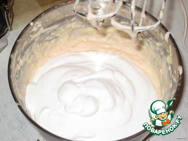 Белки с солью взбить в густую пену. В желтковое тесто добавить пару ложек взбитый белков, чтобы сделать его немного пожиже, затем добавить остальные белки, осторожно перемешать вручную венчиком или вилкой.