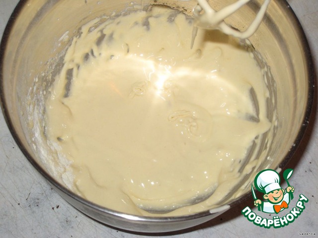 Желтки отделить от белков и растереть с сахаром в пышную белую массу. Затем добавить муку. Тесто получится густым, так и должно быть. -