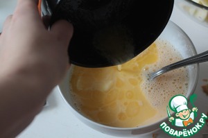 Взбить яйца с 300 мл молока, добавить размягченное сливочное масло.