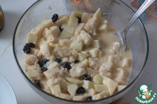 Изюм промоем и зальем кипятком, дадим набухнуть. Молочную смесь влейте к хлебу и яблокам, добавьте изюм.