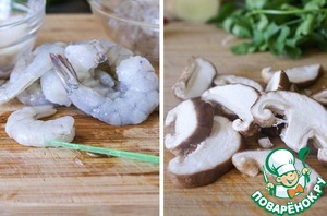 Креветки очистить от панцирей и удалить кишечную вену. Грибы нарезать ломтиками.
