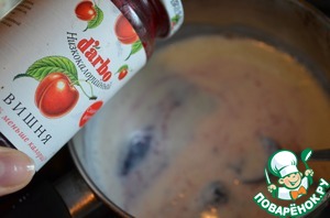 В кефир добавляем 50 мл. низкокалорийного конфитюра D'arbo. Хорошо перемешать. Слегка нагреть на медленном огне и растворить в нем набухший желатин. Сильно кефир не нагреваем, чтобы не свернулся. Если волнуетесь-снимайте периодически с огня и мешайте. Все получится.