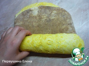 Так же раскатываем "комок" с паприкой в пласт и кладем на желтый.