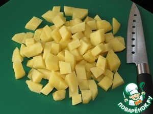 Почистить картофель, нарезать его кубиками и добавить в суп за 15 минут до готовности горошка.