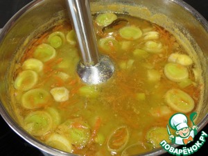 Морковь и лук - порей добавить в суп за 5 минут до готовности. Посолить и поперчить, добавить мяту и гвоздику.
