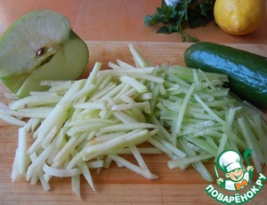 Зеленое яблоко и огурец очищаем от кожуры и нарезаем тонкой соломкой.