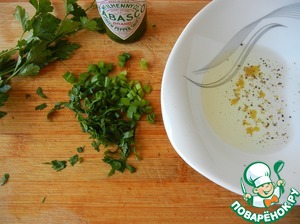 Готовить рис предпочитаю в пароварке, но можно и обычным способом. Для этого салата, я выбрала рис сорта "Басмати" от ТМ "Мистраль". Итак, рис тщательно промываем, заливаем водой и варим до готовности. Пока готовится рис займемся заправкой. Оливковое масло (4ст. л.) смешиваем с несколькими каплями табаско, добавляем соль, перец по вкусу и 2 ч. л. лимонного сока. Сейчас в период поста, такой заправки будет вполне достаточно. Если же Вы не соблюдаете пост, в таком случае, в заправку можно добавить несколько ложек натурального йогурта.