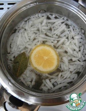 Далее очередь кальмара. Для этого салата можно взять уже отварного кальмара. Если у Вас свежий (у меня соломкой), очищаем его и отвариваем. В кастрюлю наливаем воды, солим, добавляем 2 горошины черного перца, 1 лавровый лист и дольку лимона. Доводим воду до кипения и варим кальмара около 4-5 минут от повторного закипания. Затем воду сливаем, обсушиваем кальмара и нарезаем соломкой или кольцами, кому как нравится :)