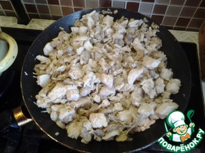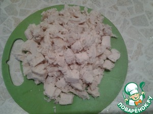 Порезать предварительно отваренную куриную грудку. Чтобы филе не было слишком сухим, рекомендуется после варки оставить его на некоторое время в бульоне.