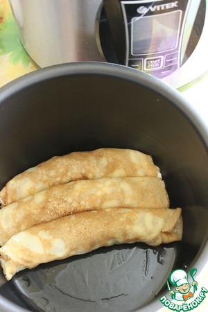 Смазать чашу мультиварки маслом, Блины свернуть в трубочку и выложить в мультиварку. Включить режим "Cake" на 15 минут с закрытой крышкой. Блинов у меня вышло на 2 запеканки. Поэтому во вторую часть блинов я также выложила оставшийся творожный крем, завернула конвертиками и положила в морозилку