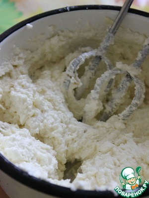 Затем в полученную массу постепенно добавлять протертый через сито творог, продолжать взбивать