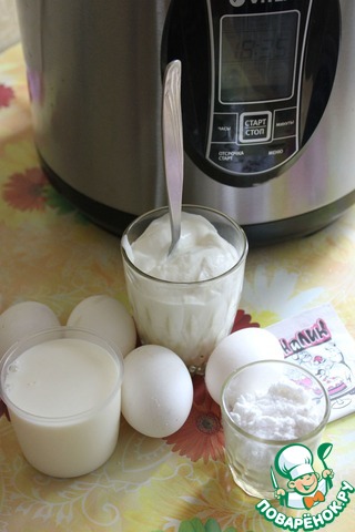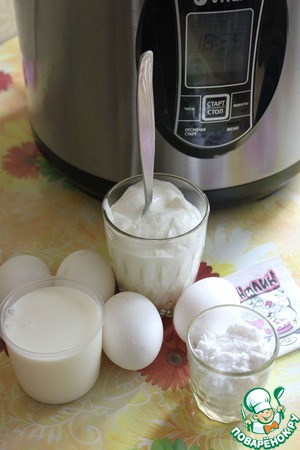 Яичные желтки - 4 шт, перемешать со сметаной, 50 г сахарной пудры, 50 мл молока.