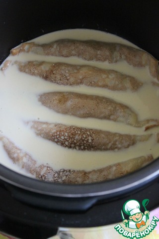 И Залить полученной смесью блины. Поставить режим "Cake"и выпекать до испарения жидкости, мне понадобилось 15 минут. Сверху посыпать сахарной пудрой или украсить по желанию. Приятного аппетита!