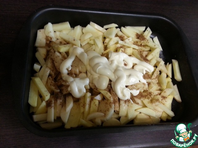 Выложим картофель на противень (можно застелить фольгой), добавим соль, приправы и майонез