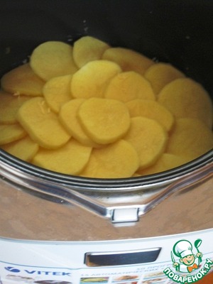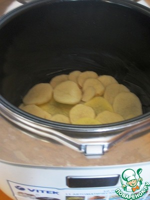Смазать маслом чашу мультиварки и выложить в нее 1/3 картофеля. Посолить