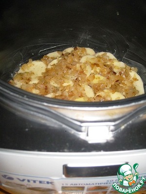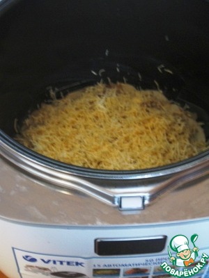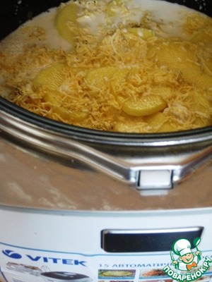 Посыпать сыром. Соединить сливки и бульон. Налить в чашу. Поставить режим "выпечка" 50 мин.