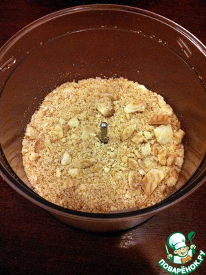 Печенье смолоть в крошку. Я делала это с помощью блендера. Добавить корицу и растопленное сливочное масло (60 г). Все тщательно перемешать.