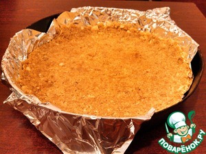 Форму (диаметр 23 см) застелить фольгой. Распределить печенье по форме, плотно утрамбовывая его. Это удобно делать чашкой. Отправить форму на 10 минут в духовку.