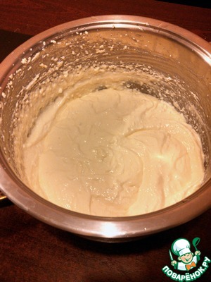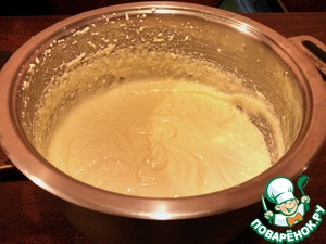 Продолжая взбивать на небольшой скорости, по одному ввести все 4 яйца. Долго взбивать не стоит - достаточно, чтобы все перемешалось.