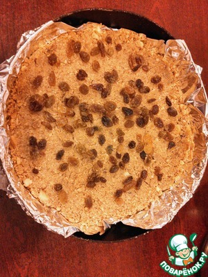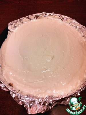 Аккуратно распределить творожную массу по коржу. Отправить в духовку примерно на час. Оставить остывать в форме. Затем отправить в холодильник на пару часов (а лучше - на ночь).