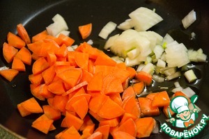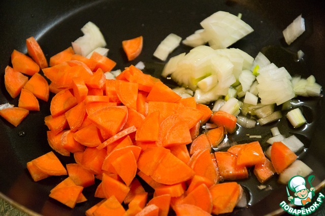 Лук и морковь нарезать и обжарить в нерафинированном масле.