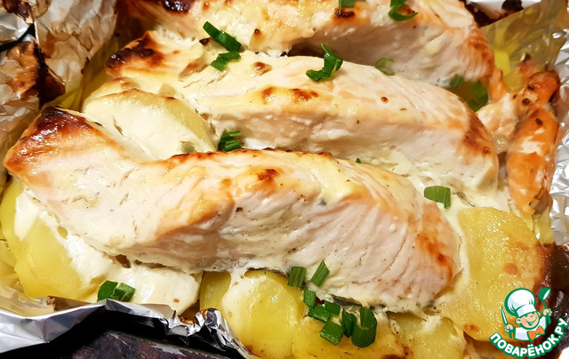 В форму смазанную маслом положить слой картошки (плотно) и сверху рыбу, в промежутки между кусочками рыбы добавить картофель. Оставшийся майонез вылить сверху на рыбу. Все накрыть фольгой и на 40 минут в духовку.