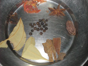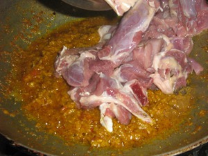 На разогретом масле жарим зиру и все цельные специи, помешивая 2-3 мин, добавляем пасту из лука, чеснока, перца и имбиря, жарим, постоянно помешивая 5 мин, затем добавляем порошок куркумы и кориандра, на медленном огне прожариваем до светло-коричневого цвета.