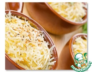 Разлейте приготовленную курицу с соусом по креманкам, присыпьте тертым сыром и запекайте в духовке при 180 градусах 10 минут.
