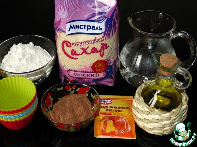 Нам потребуется: Сахар, мука, вода, растительное масло, какао, разрыхлитель.