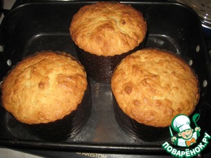Разложить тесто по формам (примерно на 1/3 форм). Когда тесто подойдет на половину (минут через 30), поставить в прогретую до 180град. духовку выпекаться. Минут на 35-40 (в зависимости от мощности духовок и объема форм). Постарайтесь сильно не поджаривать куличи, иначе они будут сухими.