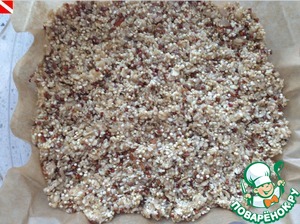 Смешиваем сухие и влажные ингредиенты вместе - получается очень густая масса. Выкладываем ее в застеленную бумагой форму ( у меня 15*15 см) и ставим в предварительно разогретую до 180 градусов духовку.