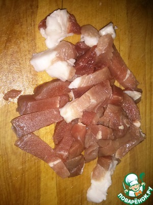 Пробежали два часа, фасоль набухла, нарезаем мясо небольшими кусочками.