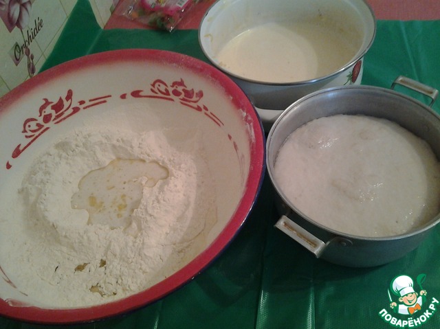 Вымешиваем тесто (чтобы тесто не липло к рукам, используем растительное масло). Будем терпеливы и со временем оно будет отставать от рук. Ставим тесто на расстойку в теплое место на 1-1.5 часа