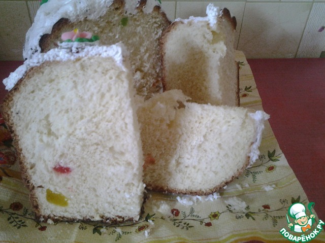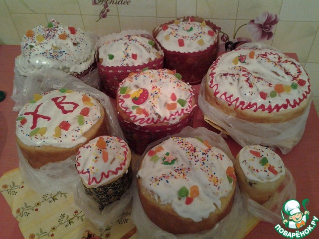 У меня получилось 4 пасхи по 500-600 г. Для глазури взбить 2 белка в пышную пену и постепенно добавить сахарную пудру. Украшаем цукатами и посыпкой кондитерской