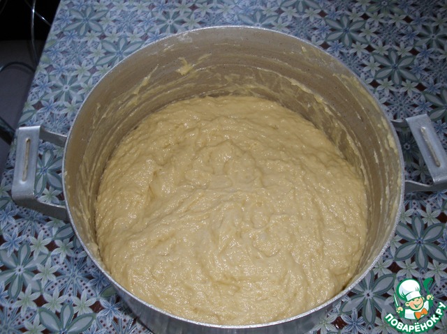 П.1. Смешать в большой кастрюле: яйца (8 шт+2 желтка), сахар, сметану, маргарин, масло сливочное.