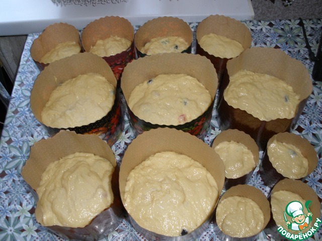 Добавляем цукаты, вмешиваем и раскладываем в формы на 1/3. Так как тесто жирное, я формы ничем не смазываю. Накрываем формы полотенцем. Оставляем примерно на 30 минут (пока тесто поднимется).