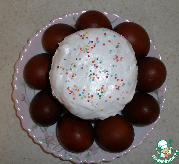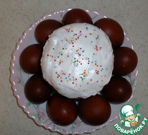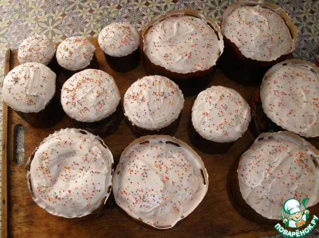 Взбиваем 2 белка + 2 ст. ложки сахара до крутых пиков. Мажем остывшие куличи белками, украшаем присыпкой.