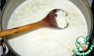 Выливаем молоко в широкую кастрюлю. Высыпаем творог в молоко и начинаем помешивать деревянной ложкой или лопаточкой, чтобы не прилипало. Доводим молоко до кипения и продолжаем варить творог в молоке примерно 10-15 минут. Огонь должен быть совсем небольшим, чтобы творог не прилип и не присыхал к кастрюле.