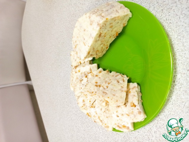 Затем перекладываем готовую массу в форму, можно предварительно выстелить ее марлей, чтобы домашний сыр лучше отошел или же переложить массу обратно в сито. И убираем сыр в холодильник. Уже через несколько часов наш твердый сыр в домашних условиях готов. Его можно резать и класть на бутерброд. Он получаетя не очень соленным, если вы любите посоленее - добавляйте чайную ложку соли и больше.