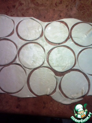 На присыпанном мукой столе раскатать слоеное тесто в пласт толщиной в 3-5 мм, вырезать 20 кружков.