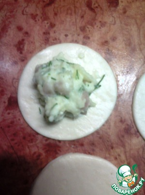 На половину кружков разложить начинку, накрыть оставшимися. Защипать края и приподнять их вверх.