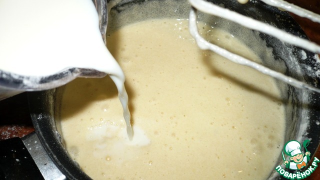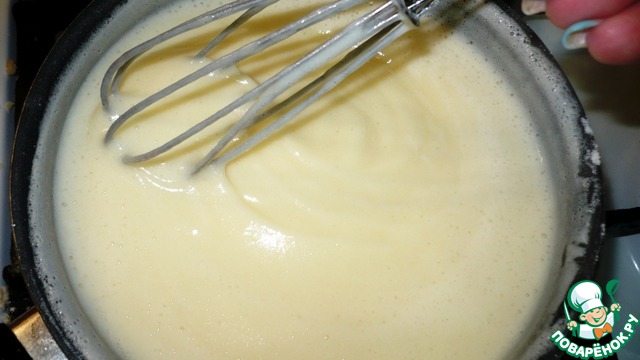 Вливаем молоко, хорошенько взбиваем и ставим варить на медленный огонь, непрерывно помешивая до загустения.