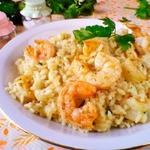 6. Пока варится рис, не переставая его периодически помешивать, надо пожарить предварительно размороженные и почищенные (если были не чищенные) креветки.