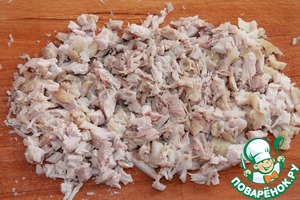 Нарезаем мелко мясо. Если вы не любите жирное мясо, то можете смело использовать грудку.