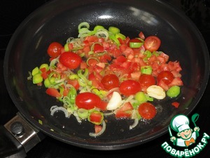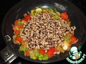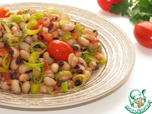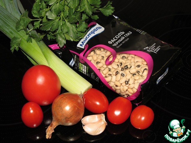 Нам понадобится: Фасоль "Черный глаз" Мистраль, томаты, лук Порей, лук репчатый, чеснок, петрушка.